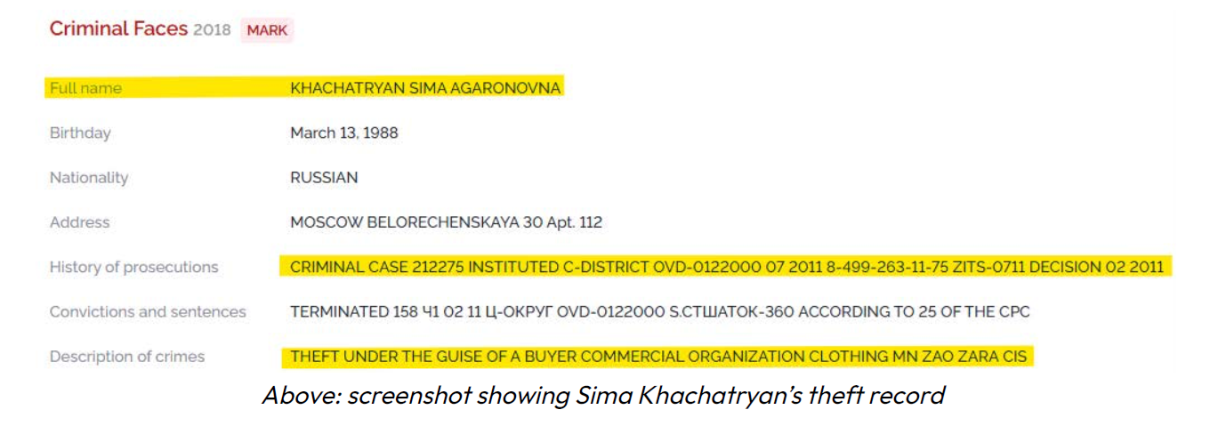 Conform înregistrărilor publice furnizate de Sherlock Report, Sima Khachatrian a apărut de două ori în baza de date cu înregistrări identice care documentează un dosar penal din 2011 privind un furt comis sub pretextul calității de cumpărător comercial, care a fost ulterior clasat în temeiul articolului 158, partea 1, din Codul Penal rus.