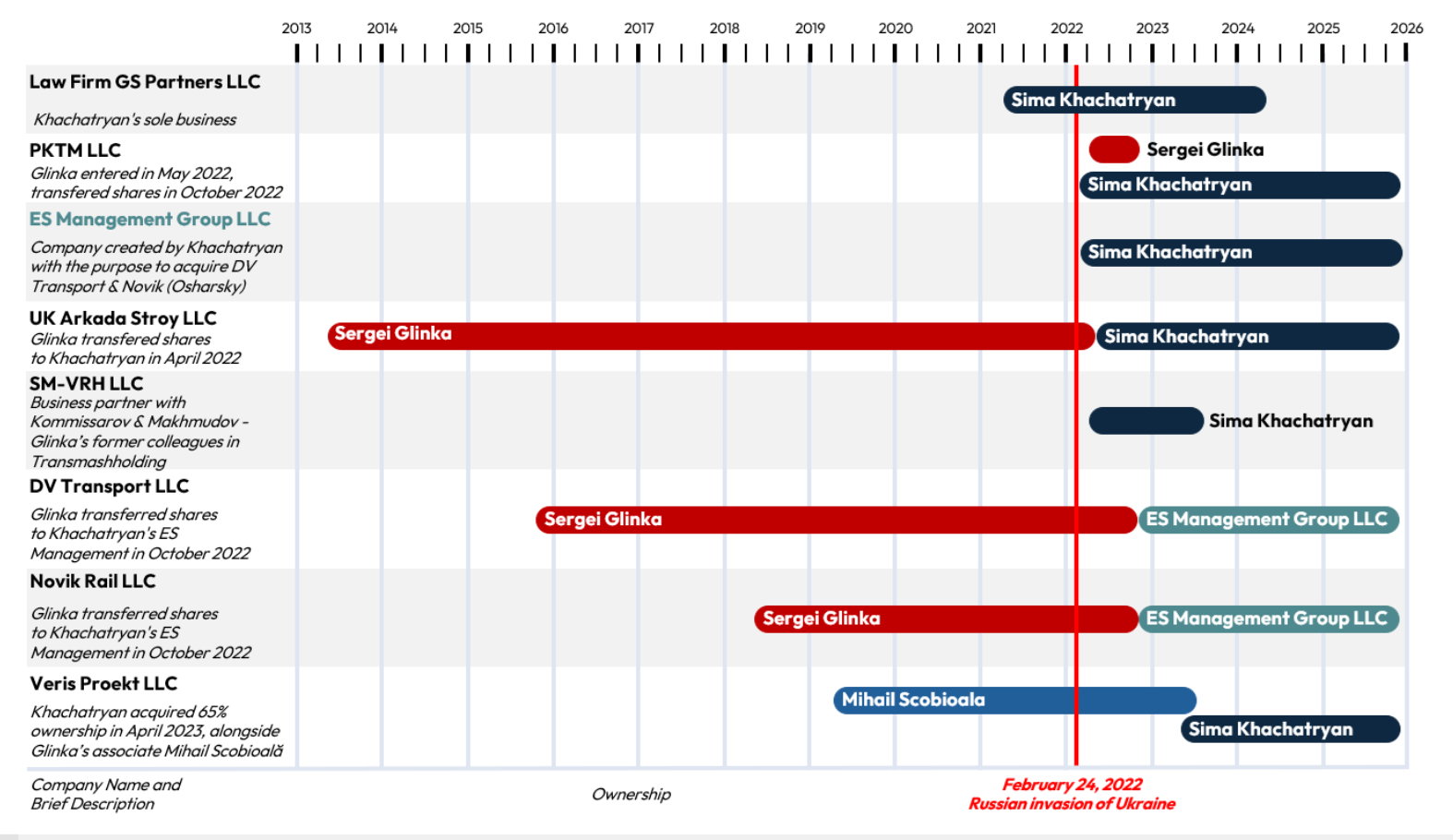 • ES Management Group LLC: înființată de Sima Khachatrian în martie 2022 cu singurul scop de a achiziționa acțiunile lui Glinka în DV Transport LLC și Novik Rail LLC (octombrie 2022);