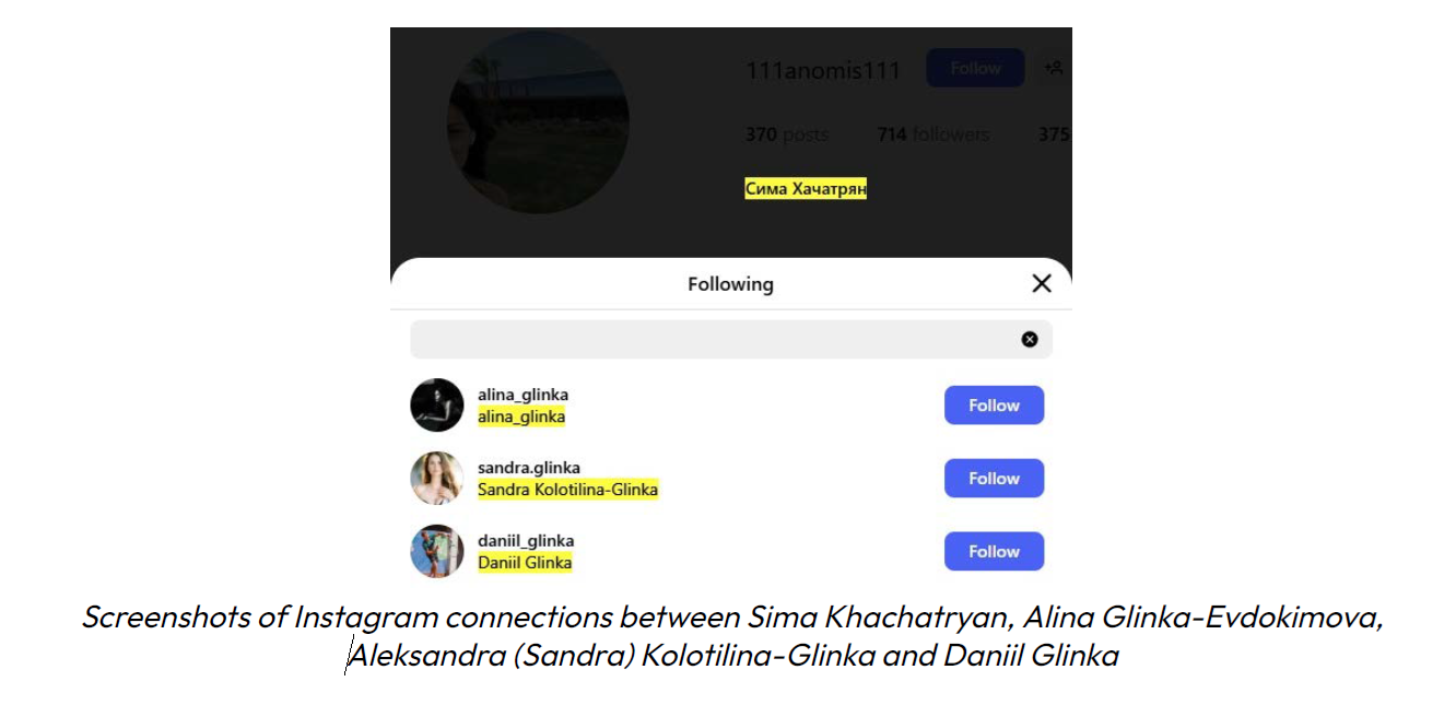 Mai multe dovezi online indică faptul că adresa de e-mail „sima@gst.ee” – aparținând Simei Khachatrian – a fost utilizată ca adresă oficială de contact atât pentru Glinka Hotel LLC, cât și pentru întreprinderea individuală „Glinka Aleksandra”, deținută de fiica lui Sergei Glinka. Potrivit datelor disponibile online, Sima Khachatrian a fost responsabilă de înregistrarea și gestionarea atât a Glinka Hotel LLC, cât și a întreprinderii individuale a Aleksandrei Glinka.