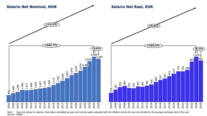 „La sfârșitul anului 2024, salariul mediu din Romania era al doilea cel mai mic din UE (43% din media europeană). Asta după ce a crescut în ultimii 20 de ani de 6 ori, în termeni nominali, și de 4 ori, în termeni reali.
