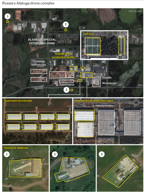 O mare parte din producția internă a Rusiei de Shahed are loc în zona economică specială Alabuga, situată strategic pe malul drept al unui râu care duce spre sud, în Marea Caspică. Pe cealaltă parte se află Iranul, ceea ce permite transportul direct al materialelor.