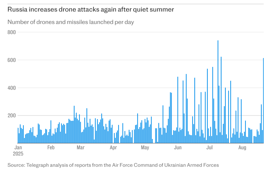 Cu doar câteva zile în urmă, Moscova a lansat aproximativ 600 de drone într-o singură noapte, în ceea ce Ucraina a descris ca fiind al doilea cel mai mare bombardament aerian de la invazia lui Vladimir Putin din februarie 2022.