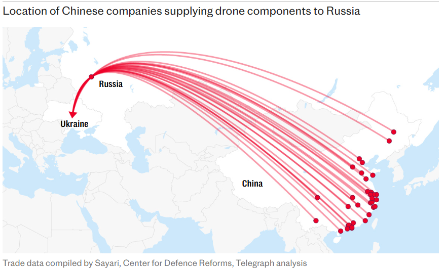 „The Telegraph” a descoperit că întreprinderile chineze au furnizat direct piese și materiale în valoare de cel puțin 47 de milioane de lire sterline întreprinderilor rusești sancționate pentru producția de drone, în perioada 2023-2024, când Moscova construia infrastructura logistică la scară largă pentru programul său intern de drone.