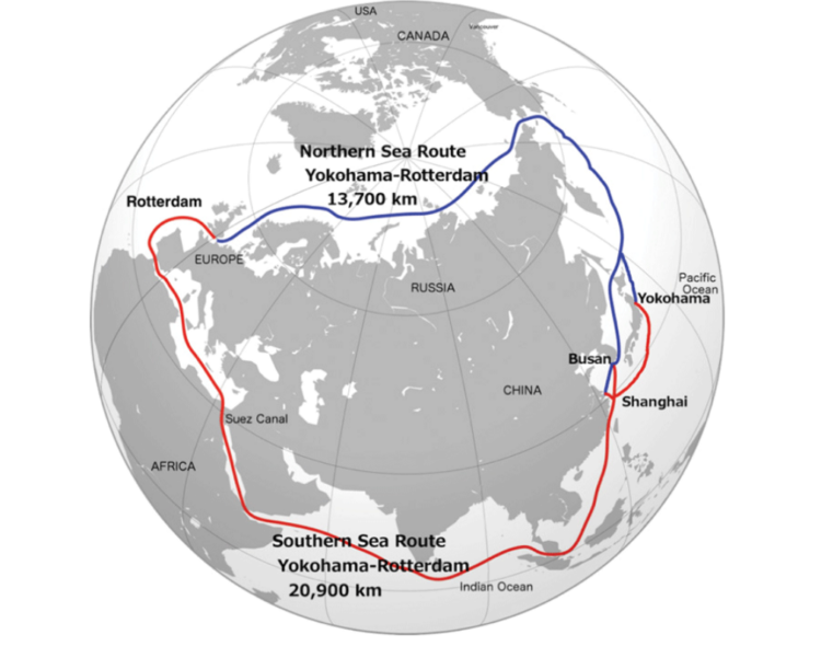 Traseul de 18 zile prin Oceanul Arctic este incomparabil mai scurt decât cel obișnuit prin strâmtoarea Malacca, Oceanul Indian, strâmtoarea Bab al-Mandab, Marea Roșie, Canalul Suez și apoi Marea Mediterană. În ultimii ani, au apărut situații de criză, precum atacurile rebelilor Houthi, care au forțat navele chiar să ocolească Golful Aden tocmai pe la Capul Bunei Speranțe, ocolind Africa și lungind durata de transport de la 40 la 50 de zile.