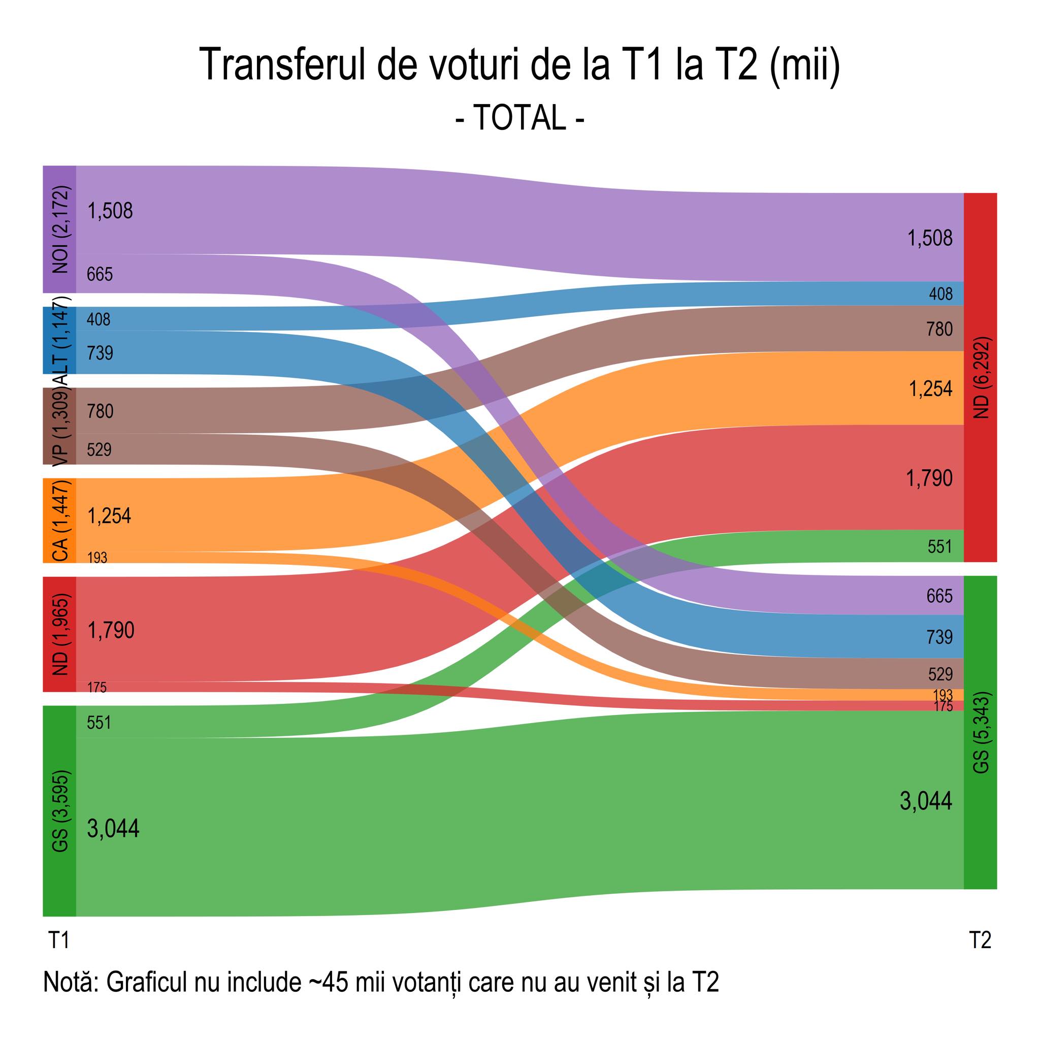 Un grafic cu valorile absolute: Mai jos un grafic alternativ de ilustrare a transferului de voturi, de această dată folosind valori absolute (mii voturi). Pentru că am exclus categoria celor care au votat doar la T1, totalurile nu reproduc exact valorile oficiale.