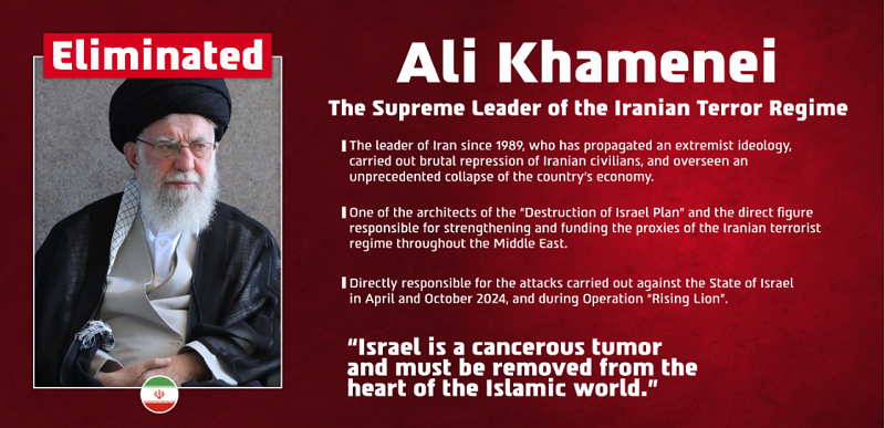 Israeli Defense Forces (IDF) a anunțat, de asemenea, eliminarea lui Khamenei.