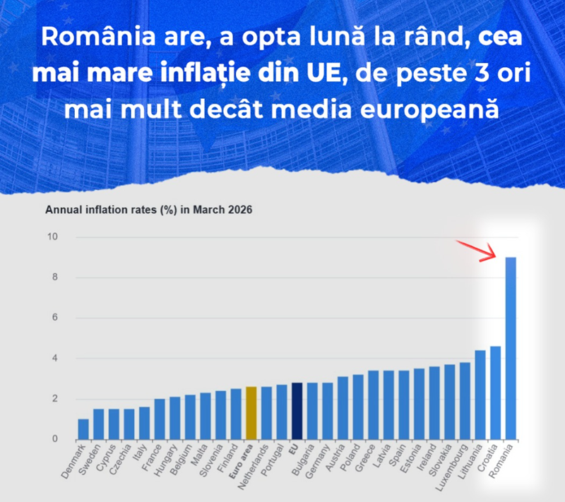 El punctează că „inflația în România în luna martie 2026 este de 9.0%, conform datelor publicate de Eurostat pe 16 aprilie, aceasta fiind cea mai mare din UE și de peste 3 ori mai mare decât media europeană (2.6%).”