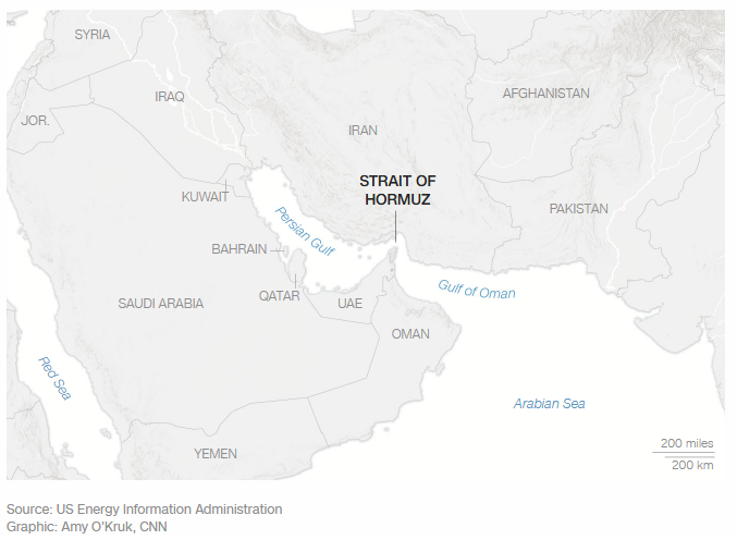 Strâmtoarea Hormuz este unul dintre cele mai importante puncte de trecere maritime din lume, care leagă Golful Persic, bogat în petrol, de restul lumii. Aproximativ 20 % din producția mondială trece prin această cale navigabilă. Iranul controlează partea nordică a acesteia.
